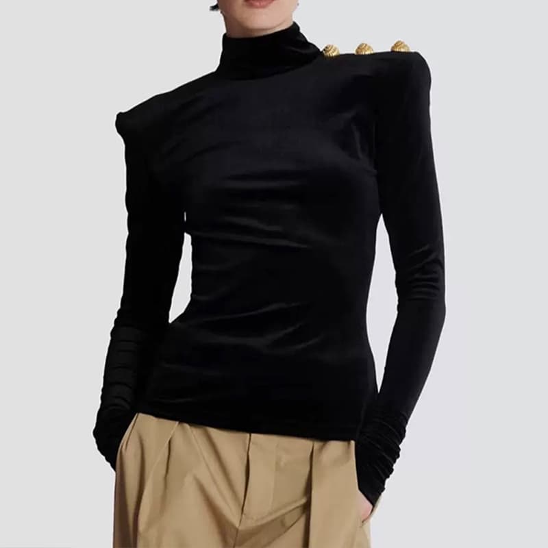 BALMAIN Best Quality Classic Threaded Lion Head Button Shoulder Badge Embellishment Versatile High Neck Long Sleeve Velvet Top FZ214
