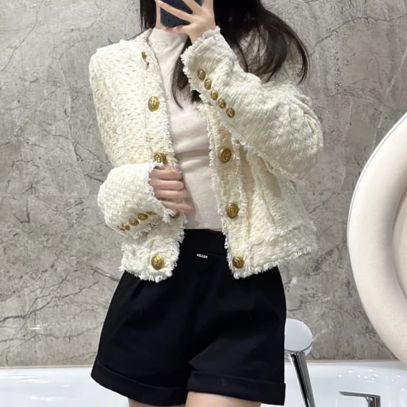 • Tasseled edge woven round collar short tweed jacket